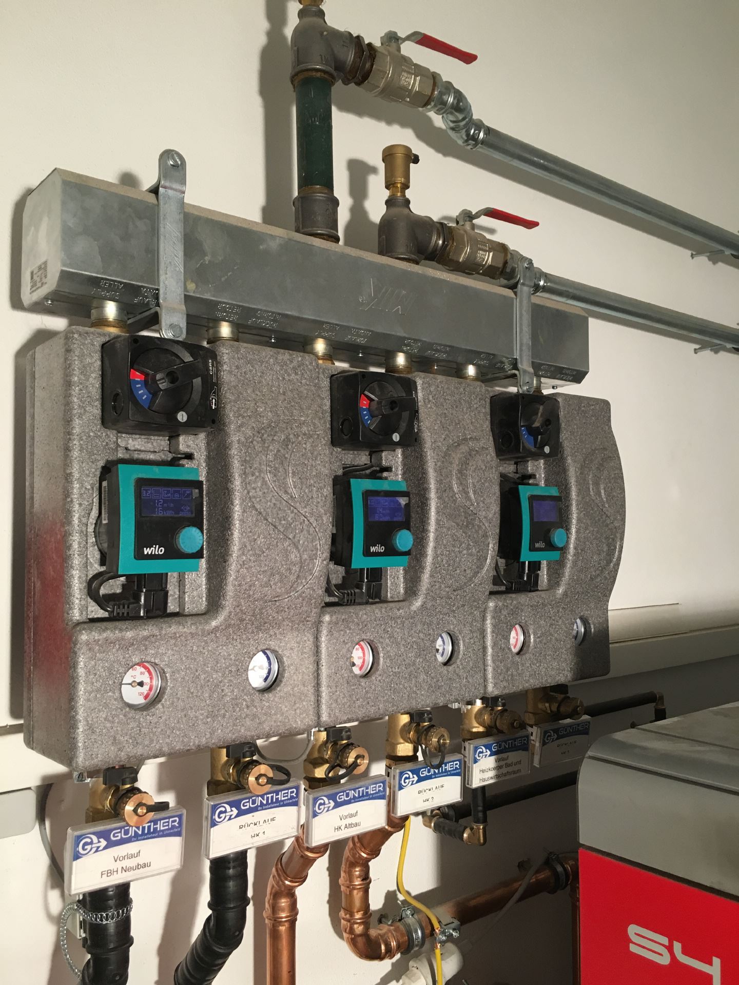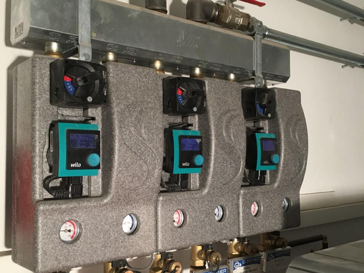 Pufferspeicher, Kombi- Pufferspeicher zur Warmwasserbereitung und Solareinbindung, drei Heizkreise (Heizkörper Altbau, Fußbodenheizung Neubau, Handtuchheizkörper Bäder)